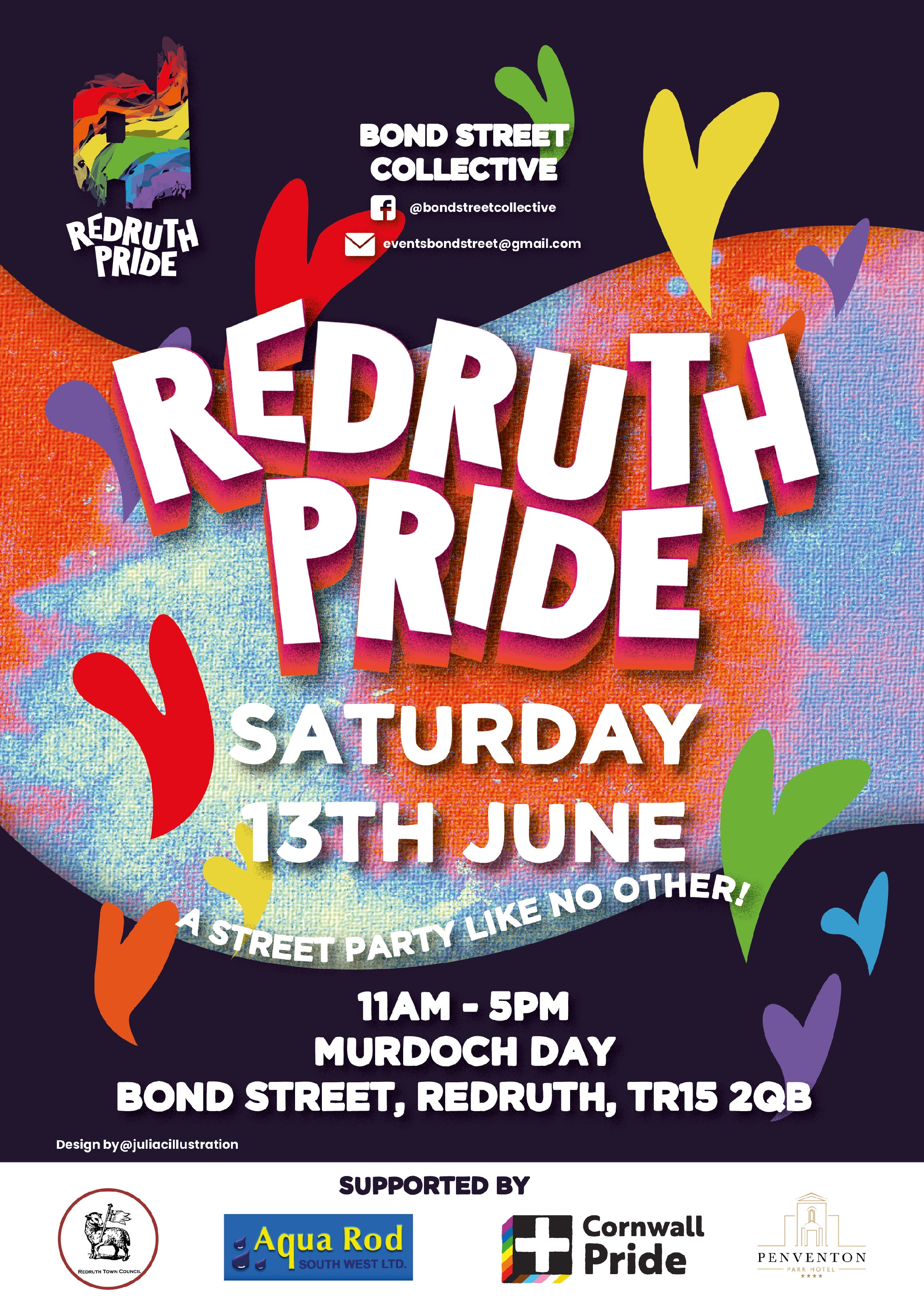 Organised by the Bond Street Collective, Redruth Pride pops up in Redruth on the 13th of June 2026 from 11:00 - 17:00. It coincides with Murdoch day.
